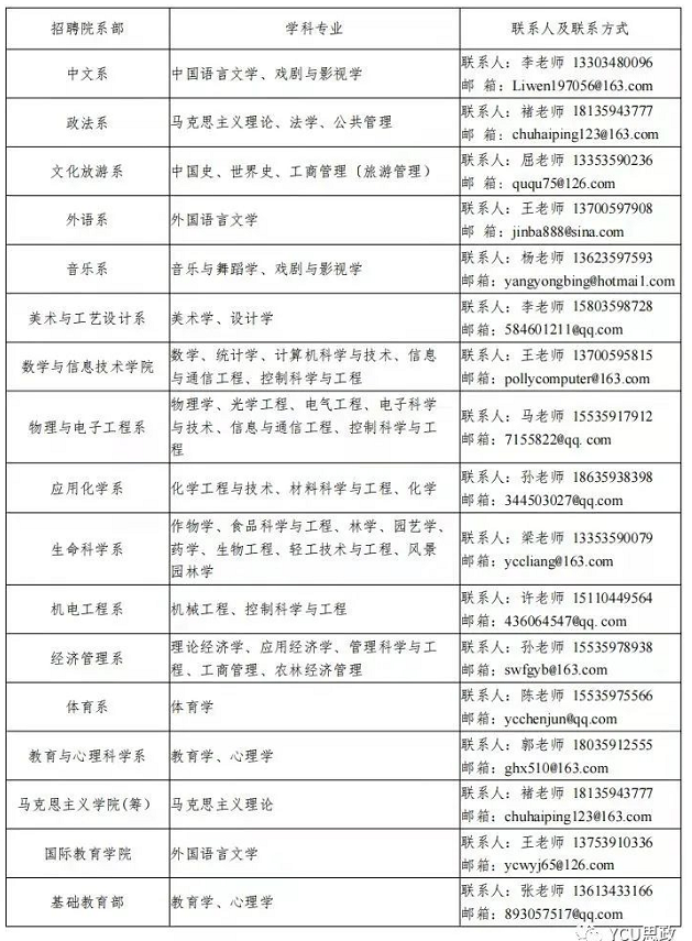 联 系 人:王老师 司老师联系电话:0359-2090084电子邮箱:ycxyrsc@ycu.edu.cn联系地址:山西省运城市盐湖区复旦西街1155号运城学院人事处邮政编码:044000